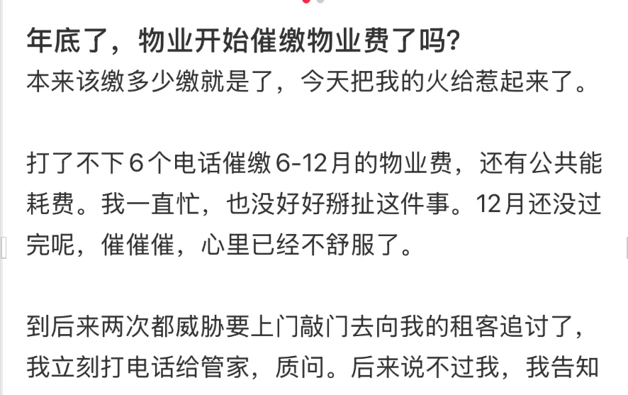 有人说收到物业发来的恐吓催收短信;还有人说物业晚上10点还上门催缴;甚至有人认为物业不干正事,只知道催款。